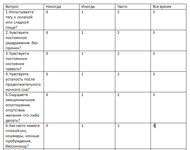 Опросник на наличие факторов стресса: Опросник на наличие хронического стресса: Оценка результатов: 0-9 баллов –низкий уровень хронического стресса; 10-21 баллов–средний уровень хронического стресса; более 22баллов–высокий уровень хронического стресса. Пишите ваш результат в комментариях! Тренируйся со мной: