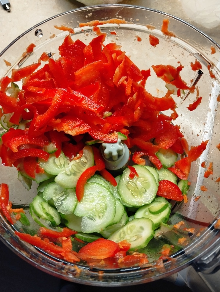 Сейчас уже можно купить молодую капусту и сегодня я купила по адекватной цене местные совхозные огурцы. Выбрала красивый красный перчик и сделала салат. Все овощи я резала в комбайне, сначала морковку червяками, а остальное насадкой-ломтерезкой. Для салата понадобится: 700гр капусты 150гр моркови 150гр болгарского перца 200гр огурцов 5з чеснока 2/3 ст л соли 3-5 ст л сахара 1ст л уксуса 9% 1чл черного перца 1чл молотого кориандра укроп/петрушка 70мл растительного масла Все овощи мелко порезать или потереть, добавить измельченный чеснок, соль, сахар, специи, уксус. Перемешать. Нагреть масло до синего дыма и залить салат. Хорошо перемешать. Убрать салат в холодильник, чтобы пропитался. Удобно, что в любое время салат готов к употреблению и не надо ничего резать и заправлять. И он хорошо хранится, в отличии от обычных салатов. Салат получился ароматный, хрустящий и красивый. Не острый. Возможно, у меня попался такой чеснок. Может я добавлю еще уксуса, если захочется остренького. Буду се