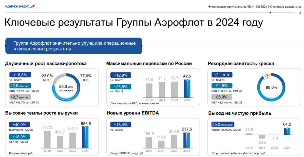 Аэрофлот представил нам фин. результаты по МСФО за 2024 г. Впервые с 2019 г. эмитент завершил год с прибылью, а значит можно рассчитывать дивиденды (с их выплатой тоже всё интересно), но если углубиться в изучение отчёта, то прибыль сложилась из разовых эффектов и помощи государства. Рассмотрим для начала основные данные: ✈️ Выручка: 856,8₽ млрд (+40% г/г) ✈️ Скоррект. EBITDA: 237,6₽ млрд (+18,4% г/г) ✈️ Чистая прибыль: 55₽ млрд (в 2023 г. убыток -14₽ млрд) 💬 За 2024 г. Аэрофлот перевёз 55,3 млн пассажиров (+16,8% г/г). На внутренних линиях пассажиропоток увеличился до 42,6 млн пассажиров (+12,8% г/г), на международных линиях до 12,7 млн пассажиров (+32,7% г/г). Процент занятости пассажирских кресел составил рекордные 89,6%, увеличившись на 2,1 п.п. год к году. 💬 Выручка выросла благодаря росту пассажирооборота (20,8%), объёму грузоперевозок (+18% г/г) и увеличению тарифов на внутренние (+21% г/г), и международные линии (+5,6% г/г). Опер. расходы увеличились до 757,2₽ млрд (+76,1% г/
