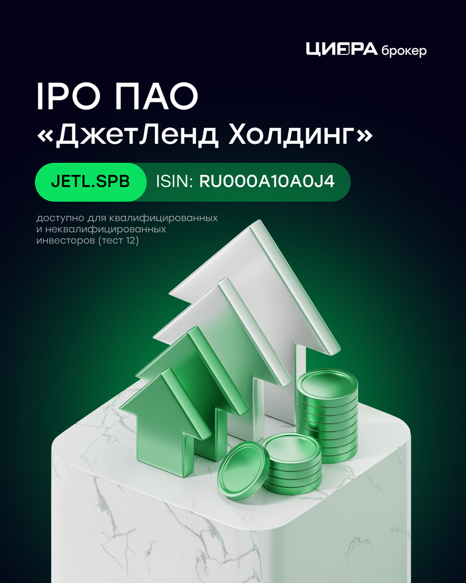26 марта 2025 года состоится IPO ПАО «ДжетЛенд Холдинг» (тикер JETL.SPB, ISIN RU000A10A0J4, регистрационный номер выпуска 1-01-06459-G от 27.02.2024). Акции включены с 05.03.2025 в некотировальную часть списка ценных бумаг, допущенных к торгам, организуемым ПАО «СПБ Биржа». 📊 Индикативный ценовой диапазон IPO установлен на уровне от 60 до 65 рублей за акцию, что соответствует рыночной капитализации ПАО «ДжетЛенд Холдинг» в диапазоне от 6,0 до 6,5 млрд рублей без учета средств, которые планируется привлечь в рамках IPO. Окончательная цена размещения акций будет определена по завершении процесса формирования книги заявок, который начинается сегодня и завершится 25 марта 2025 года. Больше информации на сайте компании. 💡 Предложение доступно для квалифицированных и неквалифицированных инвесторов — физических лиц (тест 12). Не является индивидуальной инвестиционной рекомендацией.