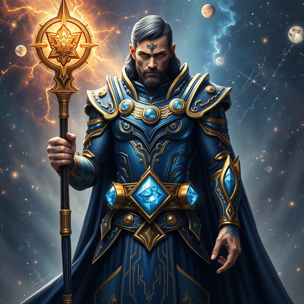 Космос стоял на краю Вселенской Арены , где время теряло смысл, а пространство смыкалось в вечность. Его синие доспехи, словно небо в момент рассвета, переливались золотом (💎) — символом власти, данной ему самой Вечностью. В руке посох, наполненный энергией, как сердце звезды, излучал оранжево-желтые вспышки (🔥) , будто воплощая в себе противостояние хаоса и порядка. «Я — не бог, но я ношу его бремя», — думал он, глядя на бескрайние туманности. Его лицо, с четкими чертами и надменным взглядом (👁️🗨️) , хранило следы тысячелетий: морщины — как звездные тропы, а щетина — как пыль космоса. Космос был пассионарным лидером, то есть тем, кто нес в себе «светоносный груз цивилизаций» . Его доспехи, инкрустированные сапфирами и рубинами (💎✨) , не были просто оружием — это были карты галактик, запечатанные в металле. Каждый узор на них рассказывал историю: падения звезд, рождение планет, битвы света и тьмы. «Я — мост между началом и концом», — шептал он , вращая посох. Из его кончика лился