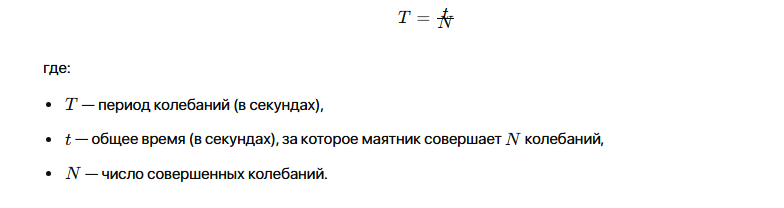 Период колебаний маятника (T)(T)(T) — это время, необходимое для завершения одного полного колебания, включая возвращение в исходное положение. Период колебаний можно вычислить по формуле: Период колебаний маятника составляет 0.5 секунды.