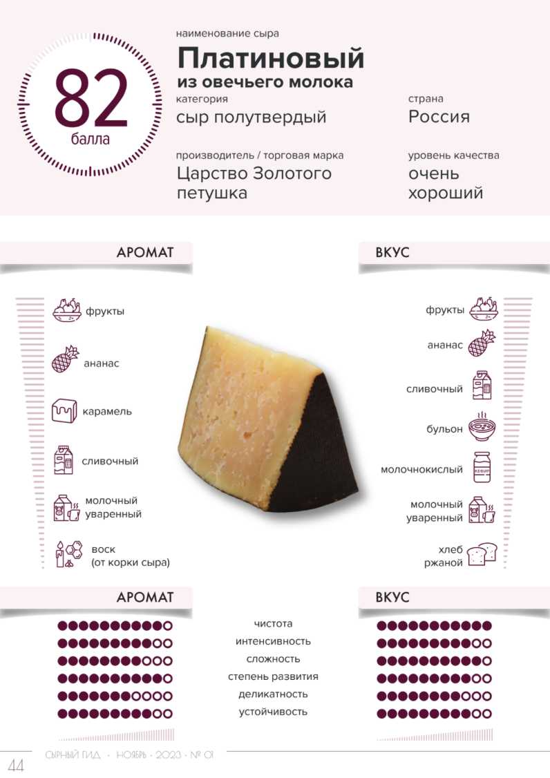 В журнале "Сырный гид" представлены результаты исследований различных сыров из разного молока: коровье, козье, овечье и смешанное. В этой статье познакомимся с сырами из овечьего молока. Сыр из молока овец варят со времен Древнего Рима. К самым популярным сырам, изготовленным с использование этого молока, относят: сыр Фета из Греции, французский рокфор, манчего из Испании, рикотта из Италии и другие. То есть производят разные категории сыров, как мягкие, так и твердые. Сложный, неожиданно фруктовый образец на пике зрелости с интенсивной ароматикой, хорошим балансом во вкусе. Причем овечье молоко в ароматическом профиле себя не проявляет в виде характерных тонов. Сыр самодостаточен, сможет разнообразить сырную тарелку и придать сложности холодным блюдам. Сыр оставляет хорошее впечатление, чистый ароматический и вкусовой профили, с узнаваемым овечьим нюансом и привлекательной творожисто-текучей консистенцией. Во вкусе характерные для срока зрелости горчинка и острота от корки сыра. Сыр