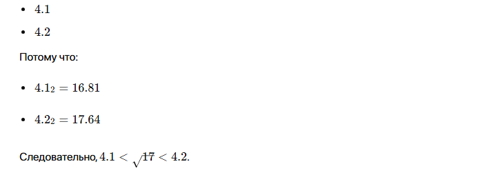Корень из 17 находится между двумя последовательными десятичными дробями с одним знаком после запятой: