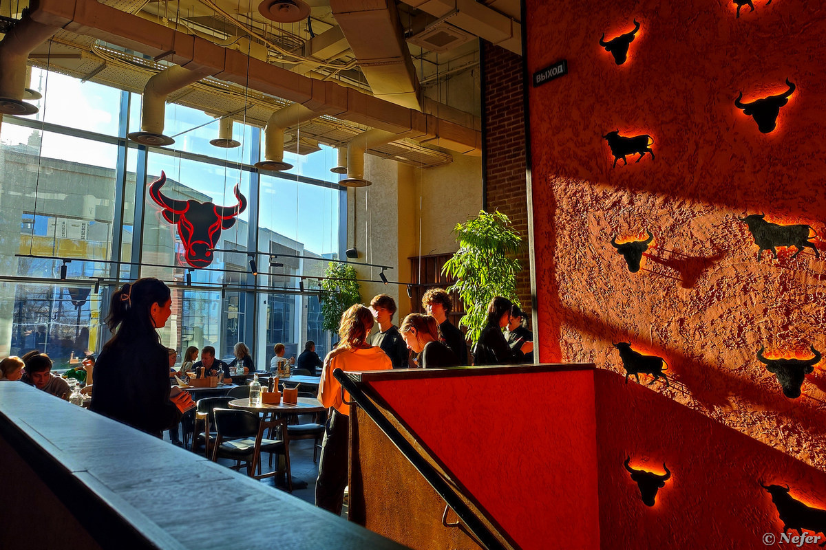 Впервые побывала в ресторане "The БЫК". Это тот, в котором все блюда по 300 рублей, включая стейки. Но так было, когда он только открылся, нынче уже 350 рублей, и это цена на базовое меню, остальные блюда дороже. Поделюсь своим опытом, расскажу, что вкусного выбрать. Количество народу произвело впечатление. В Москве 19 ресторанов "The БЫК", в них почти всегда очередь. Особенно по вечерам, а уж 8 марта и подавно. Люди стоят у входа и ожидают, когда освободится столик. Для некоторых заведений доступно бронирование через Телеграм-бота, что мы и сделали. Выбрали ресторан у подножия колеса обозрения "Солнце Москвы" на ВДНХ. Еле прорвались сквозь толпу страждущих. Честно говоря, уже закрались сомнения, что нас посадят. Но оказалось, что первый этаж - это еще не все, это лишь часть ресторана, основное пространство располагается на втором этаже. Столик достался не самый удачный, зато не пришлось тратить время на ожидание. Интерьер современный, с концепцией, нацеленный на хипстеров молодежную а