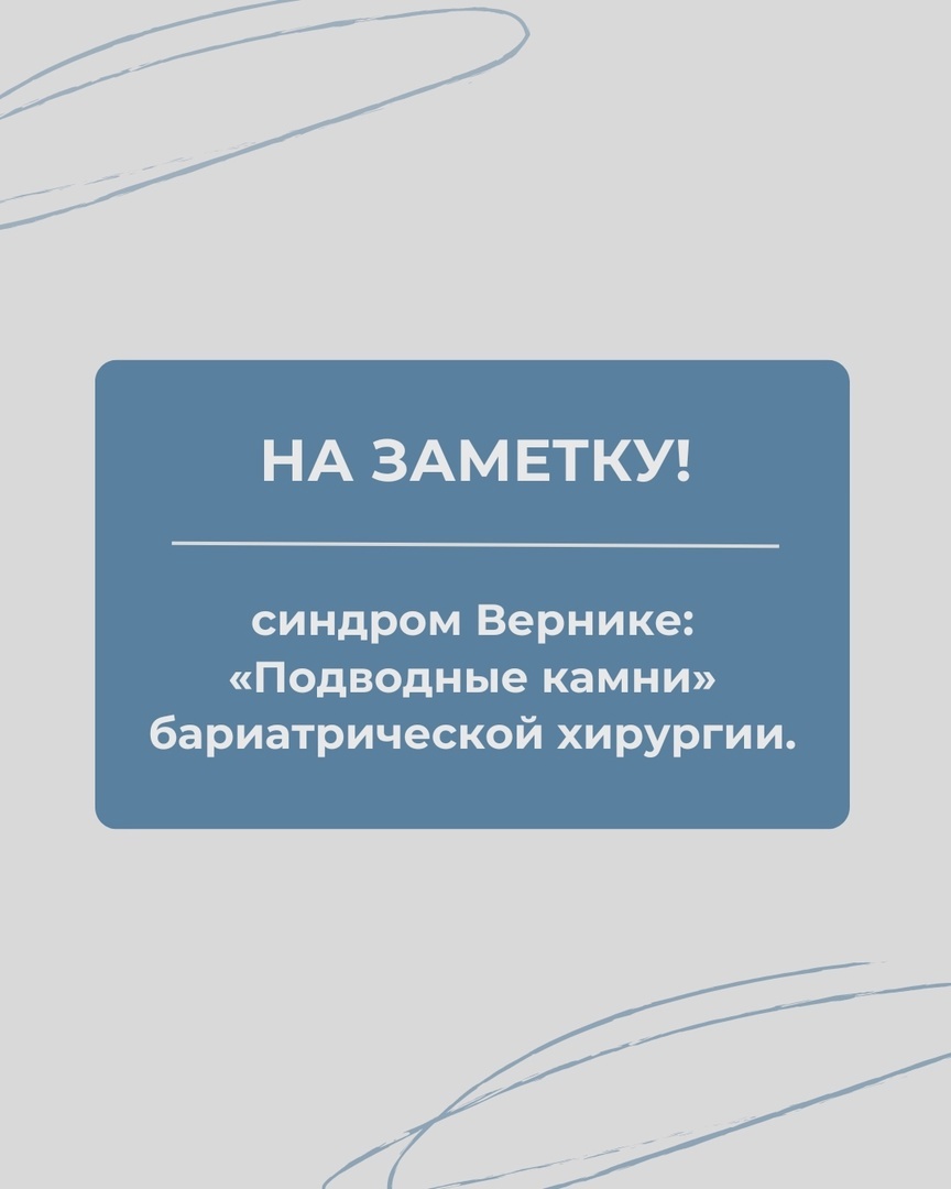 Синдром Вернике (энцефалопатия Вернике, энцефалопатия Гайе-Вернике, синдром Вернике–Корсакова). Это неврологическое расстройство вследствие дефицита витамина B1. Основной причиной является длительный прием алкоголя, при котором снижается всасывание В1 в ЖКТ. Также может встречаться и у пациентов, перенесших БО. Способствующими факторами чаще являются особенности психоэмоциональной сферы и недостаточно четкое выполнение рекомендаций по питанию, приему поливитаминов. После БО обычно возникает спустя 4-12 недель, особенно у женщин с рвотой. Часто совпадает с периодом перехода с жидкой на более твердую пищу. Первые симптомы неспецифичны - тошнота, рвота и ограничение потребления пищи. Сложность ранней диагностики заключается в схожести симптоматики дефицита витамина В1 с клиническими проявлениями после БО!!! Неврологическая симтоматика манифестирует позже, с болей в мышцах, общей слабости, парестезии в конечностях. По мере прогрессирования развиваются спутанность сознания, офтальмоплегия,