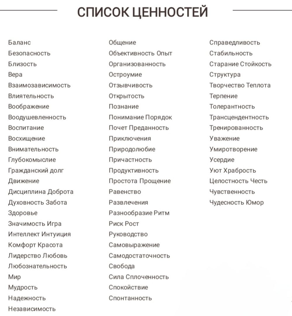 1) Берем список ценностей. Можно воспользоваться любым списком ценностей: предложенным мной или из интернета (пример поискового запроса: "список базовых ценностей человека").