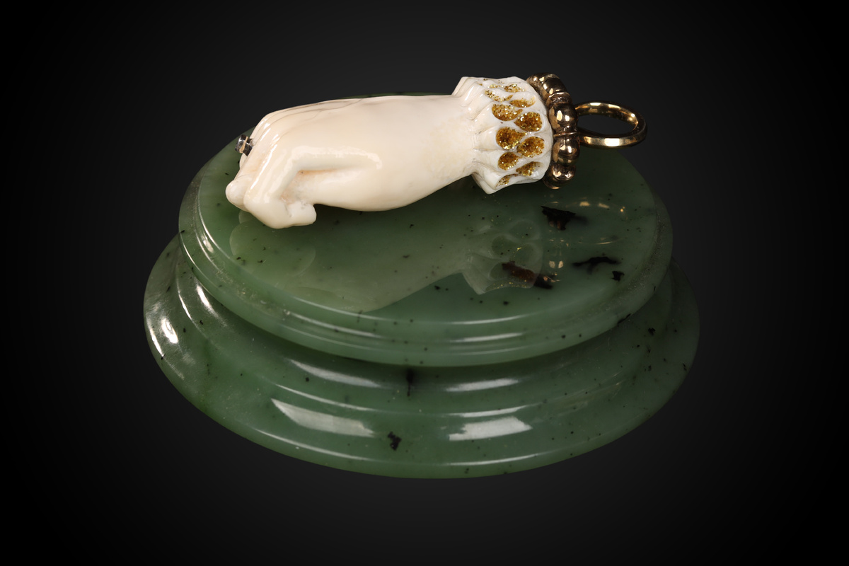 Кажется, что кукиш, или фига в простонародье, — только неприличный и даже обидный жест. Однако в славянских обычаях шиш — это оберег, который защищает от нечистой силы, ведьм и болезней. Его использовали, чтобы распознавать колдунов, уберечь себя от сглаза или порчи, а также для спасения скота от волков. В других интерпретациях кукиш — символ жизни (как и крест в древних культурах) и доминирования, превосходства над кем-либо. Шиш сделан из клыка моржа. Инуиты часто использовали клыки моржа в качестве оружия и инструментов для охоты, поэтому они ассоциировались с культурой воинов. Украшен кукиш природным бриллиантом 2,1 мм. Нередко именно этот драгоценный камень символизирует силу и могущество. Считается, что бриллиант даёт владельцу уникальные способности и вдохновляет на подвиги. Появление в жизни кулона или подвески «Кукиш» соединяют два значения — мощного оберега, защищающего от недобрых намерений соперников, и символа могущества и силы владельца, способствующего реализации его амби