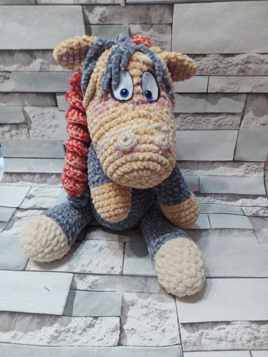 Плюшевая пряжа серый и бежевый цвета Пряжа детская новинка в две нити для гривы и хвостика Наполнитель Фетр для глаз Безопасные глазки Игла для сшивания Крючок ✓4 Бежевый цвет . 9. 4 сбн, приб *6=36 сбн 10. -15. 36 сбн 16. 14 сбн, (приб, 1 сбн)*4, 14 сбн=40 сбн 17. -18. 40 сбн 19. 8 сбн, убав *4=36 сбн 20. 4 сбн, убав *6=30 сбн 21. 3 сбн, убав *6=24 сбн 22. 2 сбн, убав *6=18 сбн 23 . 1 сбн, убав *6=12 сбн 24. 6 убав = 6 сбн Стяните отверстие и закрепите нить . Бежевый цвет . Две детали . Сложите пополам и провяжите за обе стороны 3 сбн. Оставьте нить для пришивания . Серый цвет . 12. 5 сбн, приб *6=42 сбн 13.-14. 42 сбн 15. 1 сбн, убав , 36 сбн , убав, 1 сбн=40 сбн 16. 1 сбн, убав, 34 сбн , убав , 1 сбн=38 сбн 17. 1 сбн, убав ,32 сбн, убав ,1 сбн=36 сбн 18. 1 сбн, убав ,30 сбн, убав , 1 сбн=34 сбн 19. 13 сбн, 3 убав , 13 сбн=31 сбн 20. 13 сбн, убав, 14 сбн= 30 сбн 21. 1 сбн, убав , 24 сбн, убав , 1 сбн=28 сбн 22. 5 сбн, уб