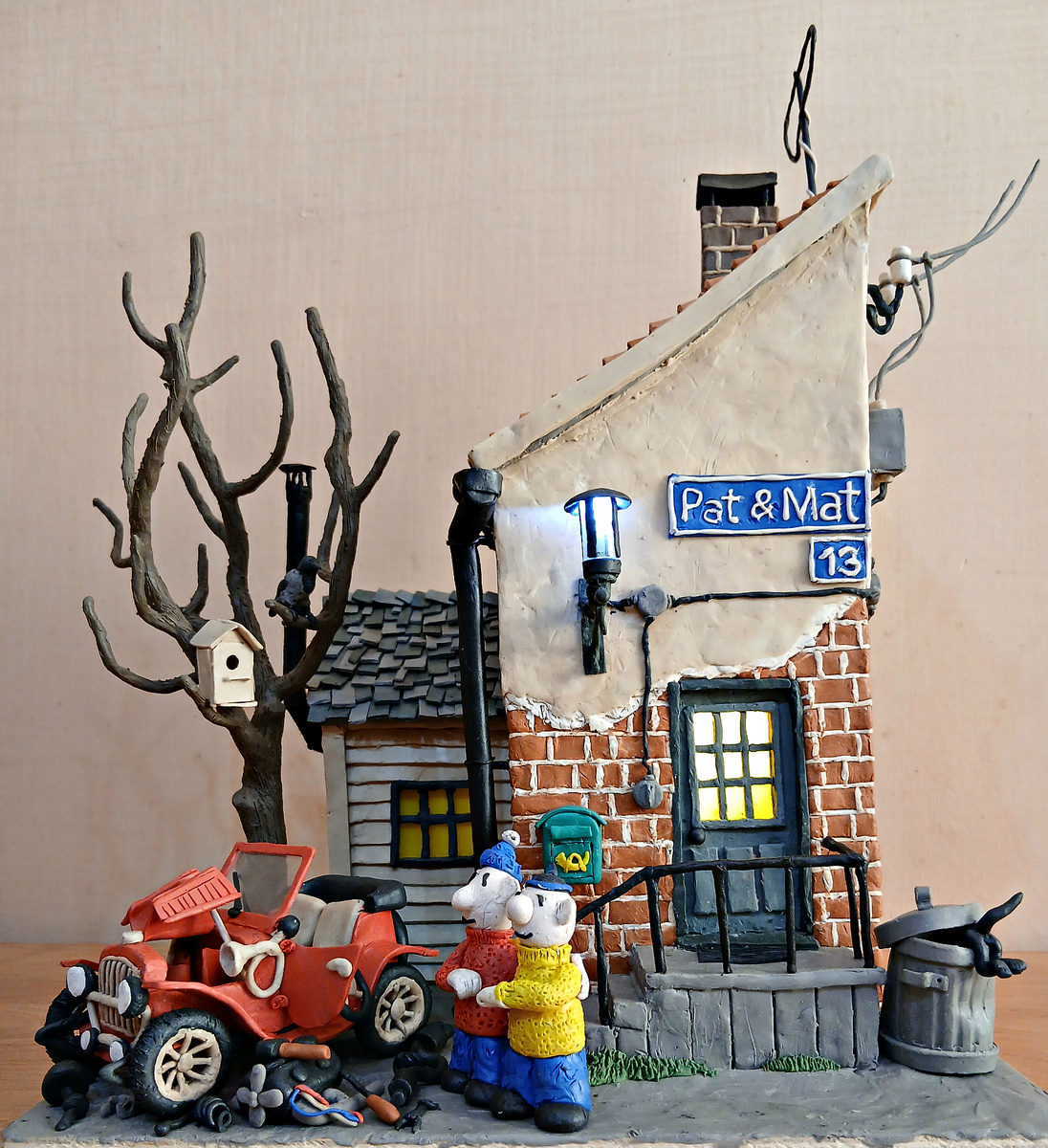 В детстве я очень любил лепить из пластилина. Строил целые города и замки, разыгрывал среди них сражения, выдумывал истории. Увы, всё это не сохранилось. Однако память надёжно все берегла, и вот совсем недавно я решил повторить опыт прошлых лет. Купил пластилин и начал творить. Сейчас собралась уже целая коллекция. В каждом пластилиновом доме есть электрическое освещение. Некоторые работы имеют историю, один из экспонатов называется: «Пат и Мат чинят автомобиль». Кто такие «Пат и Мат?» – спросят многие, отвечу – это персонажи чехословацкого мультсериала. Их ещё называют Тяпа и Ляпа. Они мастера на все руки, постоянно что-то ремонтируют, но вот незадача, всё выходит у них не так, как надо, а даже хуже, чем было. Впрочем, герои от этого не унывают, их оптимизму можно только позавидовать. В моей пластилиновой поделке Пат и Мат чинят автомобиль. Они разобрали мотор, при этом причина поломки может скрываться совсем в другой части, например, в пробитом колесе. Но мастеров это никак не нап