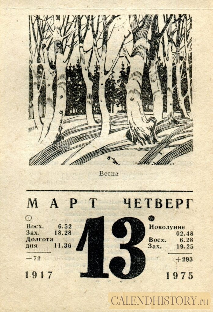 Итак, сегодня 13-го марта и у нас на календаре 1975-й год. Перед нами листок советского календаря для женщин.