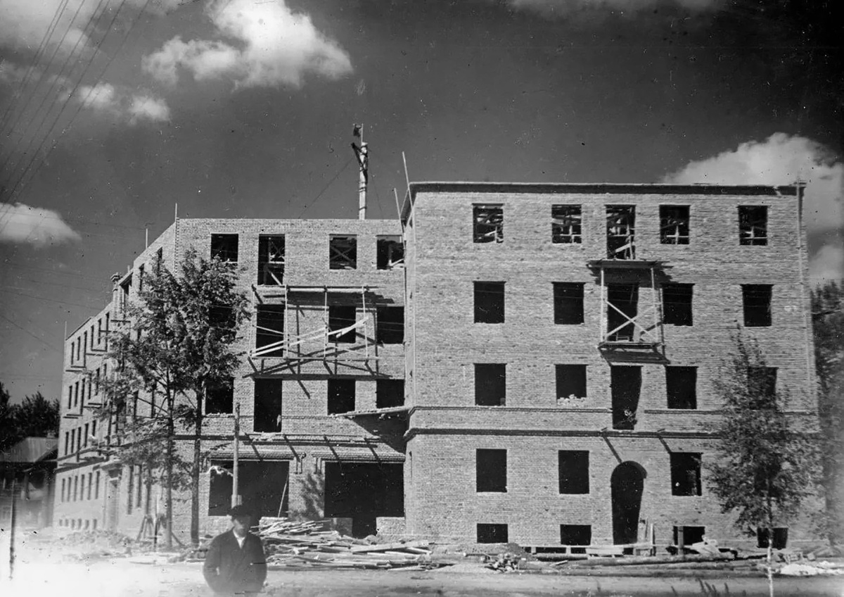1939 год. Строительство дома у перекрёстка Ленинградской и Клары Цеткин (современная улица Благовещенская).