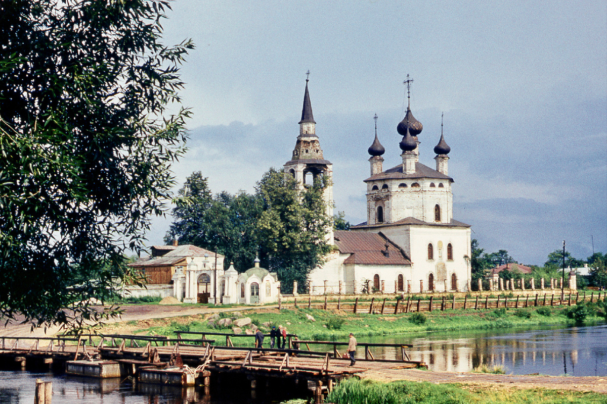 В этой публикации я хочу поделиться старыми фотографиями села Холуй с отсканированных слайдов, хранящихся у меня дома. Это старинное село находится в глубинке Ивановской области, неподалёку от города Южа. Лет десять назад я там бывал. Хотя я сам долго произносил название села с ударением на второй слог, конечно же так делать не стоит. Правильно ставить ударение на первый слог - Хóлуй. Говорят, что в стародавние времена «хóлуем» называли плетёную из ивовых веток сетку для ловли рыбы. По преданию, село было основано суздальцами, бежавшими от ордынского нашествия и нашедшими новое пристанище на берегах реки Тезы, в том месте, где устанавливались «хóлуи». Ещё одним возможным значением старого слова «хóлуй» является участок берега реки, к которому течение постоянно приносит ветки деревьев, песок и различный мусор, оказавшийся в речных водах. Все снимки в этой публикации сделаны в первой половине семидесятых годов. На этой фотографии мы видим Троицкую церковь (летнюю), построенную в 1750-м г
