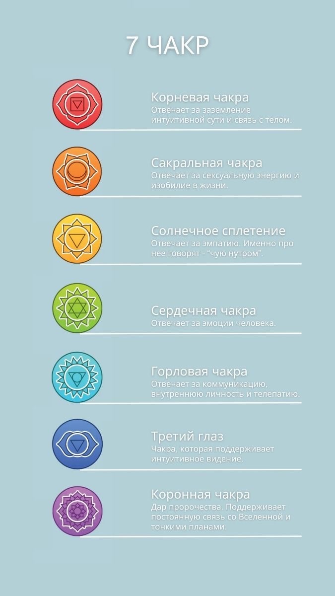 Чакры: ключ к гармонии и энергии Чакры — это энергетические центры в нашем теле, которые обеспечивают различные сферы жизни: от физического здоровья до духовного развития. Если чакра заблокирована, могут возникнуть проблемы в соответствующей области. 1. Муладхара (корневая чакра) Расположение: опора спины 🔴 Отвечает за: чувство безопасности, стабильность, выживание Дисбаланс: страхи, тревожность, финансовые проблемы, отсутствие опор в жизни ✔ Как проявляется: заземление, видимость активности, работа с постоянными страхами 2. Свадхистхана (сакральная чакра) Расположение : чуть ниже пупка 🟠 Отвечает за: эмоции, удовольствие, творчество, сексуальность Дисбаланс: подавленные эмоции, творческая застой, проблемы в отношениях, низкое либидо ✔ Как проявляются: проявления, творчество, проявление своей чувственности 3. Манипура (чакра солнечного сплетения) Расположение: область пупка 🟡 Отвечает за: сила воли, самооценка, личные границы Дисбаланс: неуверенность, страх осуждения,