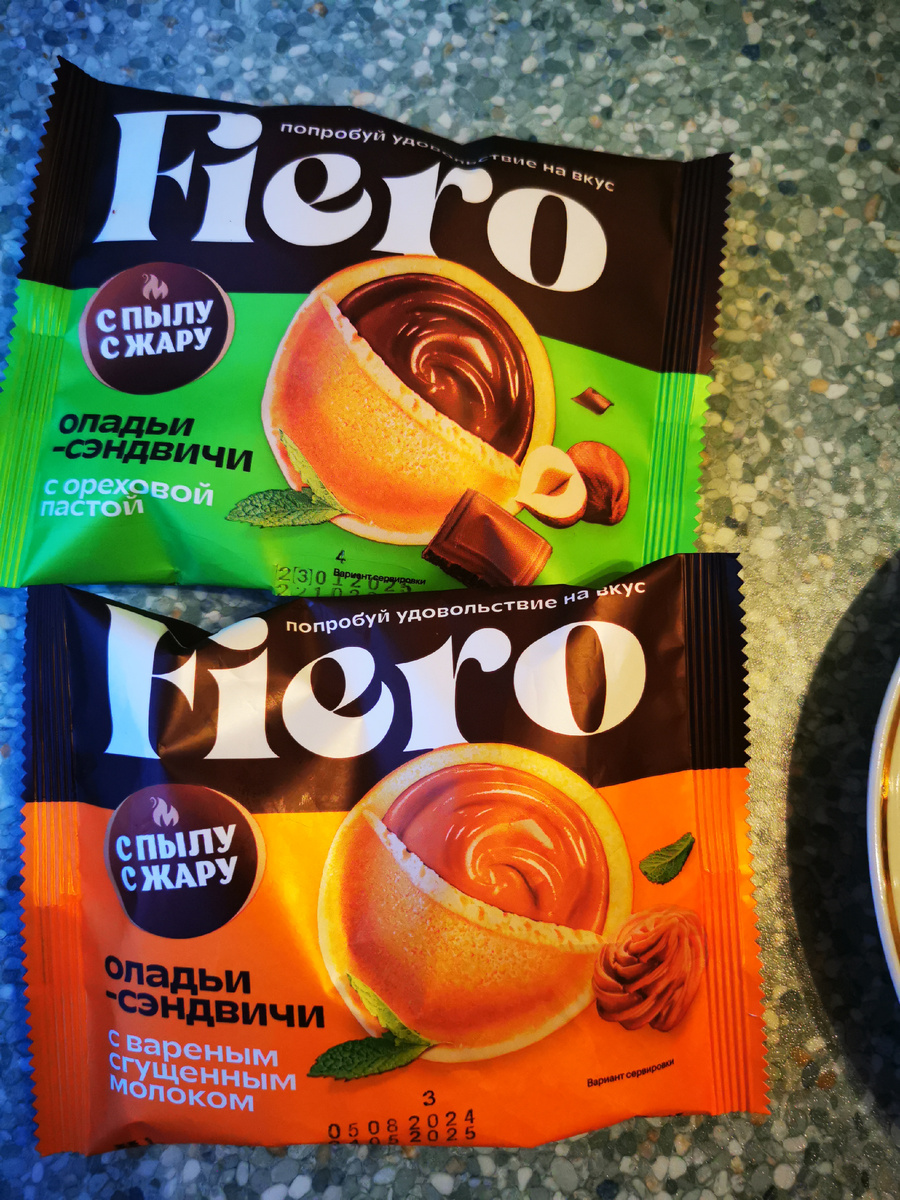 Продолжаем пробовать разное, ведь как говорится в жизни нужно попробовать всё 😁 Некоторое время назад я увидела в магазине вот такие замороженные оладушки с начинкой. Сначала подумала, что не мой вариант, так как микроволновки нет, значит и подогреть будет сложно. Но, прочитала инструкцию и выяснилось, что можно просто оставить при комнатной температуре на полчаса и они сами разморозятся. Раз всё так просто, значит надо брать, подумала я. У меня было два вкуса: с варёной сгущёнкой и с ореховой пастой. Возможно есть и другие, тут ничего сказать не могу. Дома выложила их на стол и стала ждать. Прошло, мне кажется, больше 30 минут, когда я их открыла. Мне они показались слегка холодными и на всякий случай я подержала их рядом с туркой, в которой варилось кофе. Вот такой вот оладушек оказался внутри. Когда на него смотришь, то кажется, что внутри прямо много начинки, но.... когда откусываешь понимаешь, что это два толстых оладушка, соединенных вместе, а в центр немного начинки. Не мо