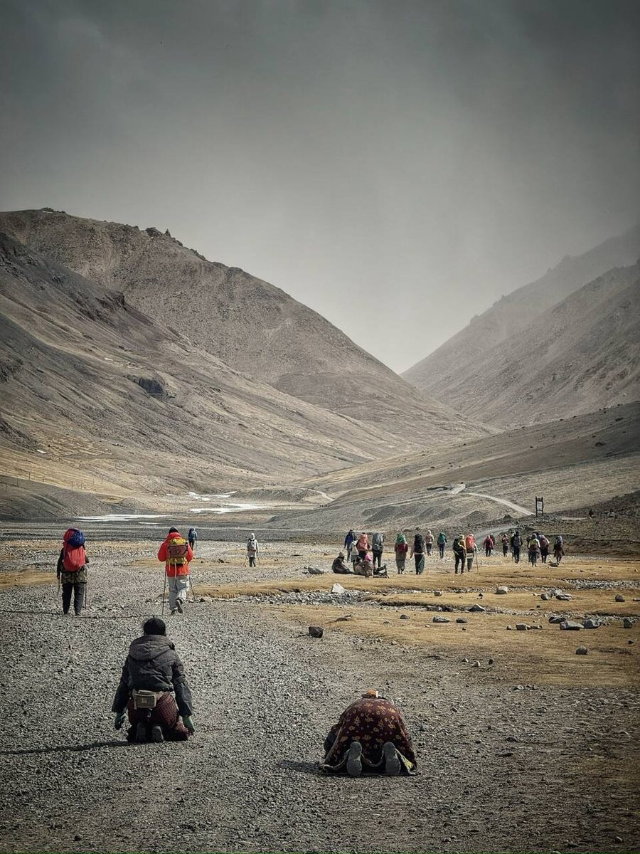 Фотовыставка Максима Плаксина «Привет, Тибет». Апрель, май 2024. Обычный маршрут парикрамы (коры) вокруг Кайласа имеет длину 53 км и занимает 3 дня. Суммарный набор высоты при этом больше 1,2 км, максималная высота - 5640 м. Некоторые местные могут пройти весь маршрут за один день. Рекорд прохождения коры - 9 часов. Но для истинных практикующих кору нужно совершать «простираниями»: 1. Перед началом простираний буддист порождает в себе правильные устремления - очиститься от негативной кармы и достичь определённой цели и читает соответствующие мантры. Также практикующий простирания совершает необходимые визуализации Учителей, Будд, Бодхисаттв, Защитников и йидамов, кроме того, представляет себе то бесчисленное количество тел, которым он обладал во всех своих жизнях и которые сейчас будут выполнять простирания в его нынешнем теле. 2. Сложив ладони в форме нераскрывшегося лотоса, которому подобен непросветлённый ум, практикующий подносит их к макушке головы. Затем прикладывает их к подборо