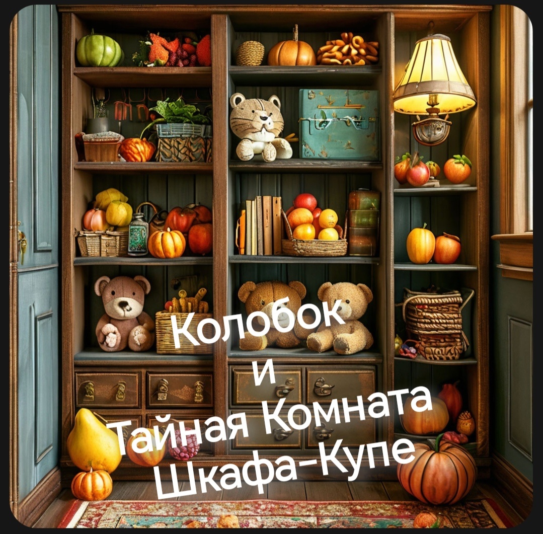 В полумраке шкафа, среди висящих платьев и рубашек, Колобок, сияя от счастья, обустраивал свою тайную комнату. Мишка Михаил Потапыч был усажен на стопку полотенец, динозаврик стоял на страже у входа, а книжка со сказками лежала раскрытой на коленях у Колобка.