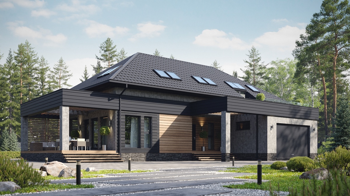 Проект двухэтажного дома с мансардным этажом Сен-Жермен площадью 384 кв.м —это баланс между функциональностью, эстетикой и уютом. Архитектурный стиль дома отражает дух современного минимализма. Простые геометрические линии, большие панорамные окна и использование контрастных материалов, таких как бетон, дерево и стекло, придают дому уникальность и элегантный шарм. Брутальная архитектура подчёркивает стиль и статус дома. Главное преимущество дома с мансардой заключается в рациональном использовании площади. Первый этаж становится центром семейной жизни и располагает функциональными помещениями, обеспечивающими быт. Здесь разместились: Интуитивное зонирование делает каждую функцию дома удобной для ежедневной жизни. Открытая гостиная зона способствует созданию уютной атмосферы для общения. Поднимаясь на второй этаж, мы попадаем в пространство, предназначенное для личного уединения. Этот уровень создан для отдыха и полного расслабления, где каждый член семьи найдёт своё пространство. Зде