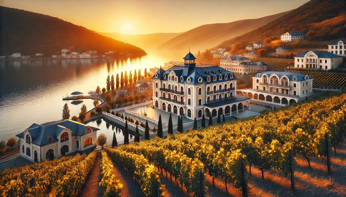 Роскошный отель, расположенный в непосредственной близости от озера Абрау, предлагает гостям изысканные номера и спа-центр с шампанским.