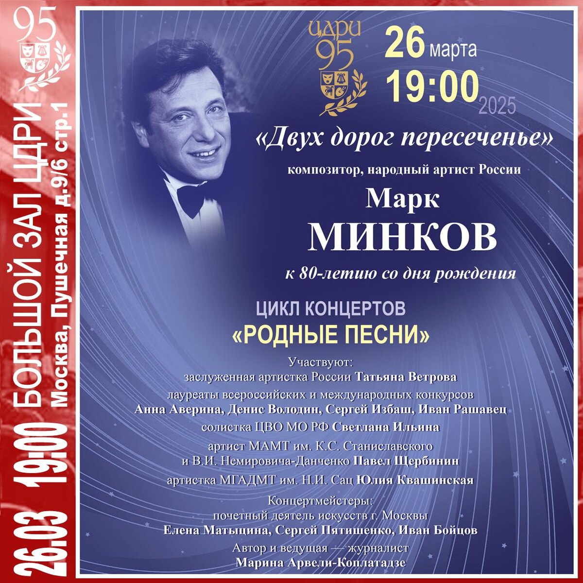 Цикл концертов «Родные песни» к 80-летию со дня рождения композитора и народного артиста России Марк Анатольевич Минков — композитор, народный артист России, заслуженный деятель искусств РФ. Был членом Российской академии кинематографических искусств «Ника», членом Союза кинематографистов, президентом Гильдии композиторов кино. Марк Минков родился 25 ноября 1944 года в Москве. С пяти лет начал учиться играть на пианино. По окончании музыкального училища, поступил в Московскую консерваторию в класс Арама Хачатуряна. В 1970 году Марк Минков стал членом Союза композиторов СССР. Популярная песня на стихи А. Горохова «Незримый бой», долгие годы была неотъемлемой частью известного телевизионного сериала «Следствие ведут знатоки» и стала гимном работников милиции. Его музыка звучит в таких картинах как «Без права на ошибку», «В зоне особого внимания», «Мы из джаза», а также в известном мультипликационном фильме «В