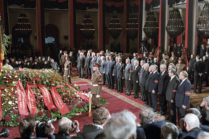 Из дневника Анатолия Черняева, заместителя заведующего международным отделом ЦК КПСС (1970–1986 гг.), помощника генсека и президента Горбачёва (1986–1991 гг.): «В толпе членов и кандидатов в члены ЦК — когда они скопились за полчаса до выноса гроба у выхода из Колонного зала, атмосфера была как на толкучке: громко хохотали, обсуждали разные дела, через головы других обменивались всякими «посторонними» репликами, насмешливо приветствовали друг друга, обсуждали, не холодно ли будет: ведь еще полтора часа быть на улице. Словом, «всенародная скорбь» никак не коснулась состава Центрального Комитета. Во время «пиковых моментов» похоронной церемонии только иностранцы снимали шапки».