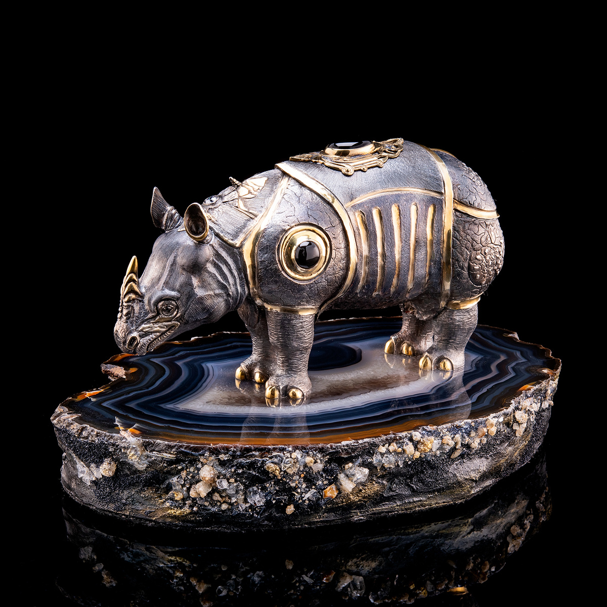 И эта скульптура из ювелирной бронзы, украшенная кристаллами Swarovski, продолжает многовековую традицию в изображении носорога, заложенную в эпоху Северного Возрождения. Уникальное сочетание драгоценных камней и металлов — физическая интерпретация впечатления Дюрера от описания столь мощного и могучего животного. Бронза с золочением 24 карата символизирует стойкость зверя и непробиваемость его брони. Чёрный оникс придаёт ощущение стабильности и безопасности. Вставки из агата — камня, который издревле считается гарантом мира и спокойствия — передают чувство умиротворения.
