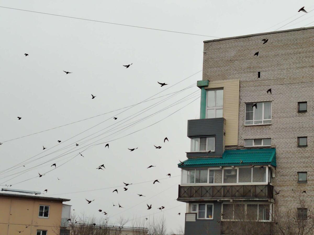 Я сегодня выглянула на улицу, когда готовила завтрак и увидела ,что всё небо покрыто птицами. Стайка то ли стрижей то ли свиристелей мчалась по небу , на всё небо. Птицы прилетели с юга, так красиво это было.