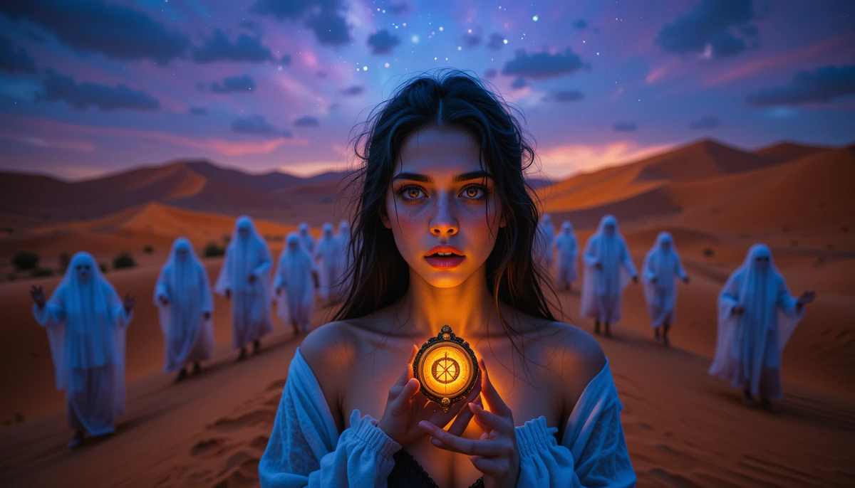 Сердце Сары сжалось от смутного предчувствия. Она бросилась к зеркалу в ванной, чтобы взглянуть на себя и убедиться, что всё в порядке. Но отражение смотрело на неё иначе — глаза светились мягким, призрачным светом, как у деда в ту ночь, когда он взял амулет из её рук. Шепот зазвучал прямо в её голове, отчётливый и холодный: "Ты теперь хранительница... Пустыня выбрала тебя." Она отступила назад, но отражение не сдвинулось с места — оно осталось в зеркале, слегка улыбаясь, словно знало что-то, чего не знала она сама. Сара моргнула, и всё вернулось на свои места: обычные карие глаза, усталое лицо. Но сомнение уже пустило корни в её душе.