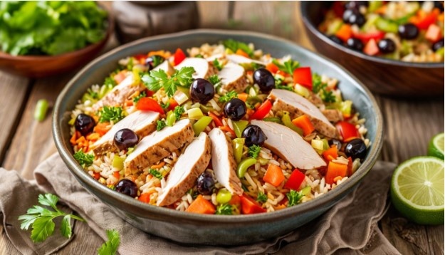 Не знаю, как вам, но мне весной очень хочется витаминных салатов. От самых простых, до интересных и необычных. Имея много рецептов подобных блюд, я хочу поделится ими с вами. У каждого народа и в каждой стране есть свои традиции приготовления салатов, в частности таких, где используются остатки готовой еды. К примеру, после праздничного дня или просто ставшиеся от вчерашнего обеда или ужина. В этом рецепте понадобится белое мясо индейки или курицы, а также отваренный готовый рис. Кстати, те, кто соблюдает пост может просто исключить мясо из салата и тоже получить прекрасное блюдо. Так же понадобится отварной длинный рис, который нужно приготовить заранее. В салатах важнейшую роль играет заправка. От нее будет зависеть вкус готового блюда, попробуйте поэкспериментировать с заправками, коих много на этом канале. С заправки и начнем. В большую миску выкладываем измельченный (раздавленный) чеснок, добавляем масло, уксус, лимонный сок, черный молотый перец, соль и хорошо взбалтываем. Всегд
