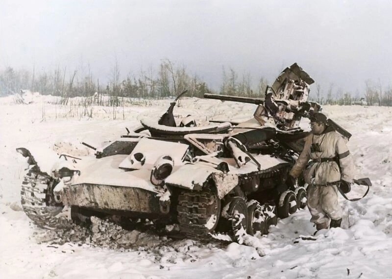 Подбитый и полностью выведенный из строя советский танк английского производства «Валентайн» стал предметом любопытства военнослужащего Вермахта. Немец вооружен трофейным пистолетом-пулеметом ППШ-41. На левой руке у солдата опознавательная повязка свой-чужой. Такие повязки менялись цветами примерно раз в неделю. #история #война #танк