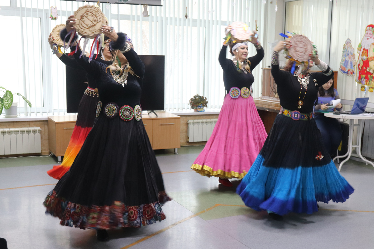 Елена Дьяченко, с которой мы познакомились в Москве пригласила нас на концерт в пансионате "Солнечный". Там мы познакомились с замечательной группой "серебряных" волонтеров танцевального направления "Трайбл" проекта "Исцеление творчеством". Они подготовили для жильцов КГБУ СО Пансионата "Солнечный" замечательный концерт. Программа называлась "Снежно-нежная музыка зимы", а танцы были зажигательными. Открыли программу соло группа "Арабески" Елена Дьяченко, Юлия Подболоцкая, Татьяна Варлачева, Инесса Ефремова под этническую музыку Гуруде немного "пошаманили" исполнив танец "Дыхание степи", затем "Испанский танец" от Полины Власовой преподавателя Центра Трайбл культуры пластики тела "Манго", он добавил огня. "Мир танца" Библиотека им. Романа Солнцева г. Красноярск руководитель Юлия Подболоцкая и ее группа зажгли в новогодних шапочках под любимую песню "А снег идёт, а снег идет" и современную очень популярную композицию "Матушка Земля" Продолжилась программа танцем "Импровизация" под песню