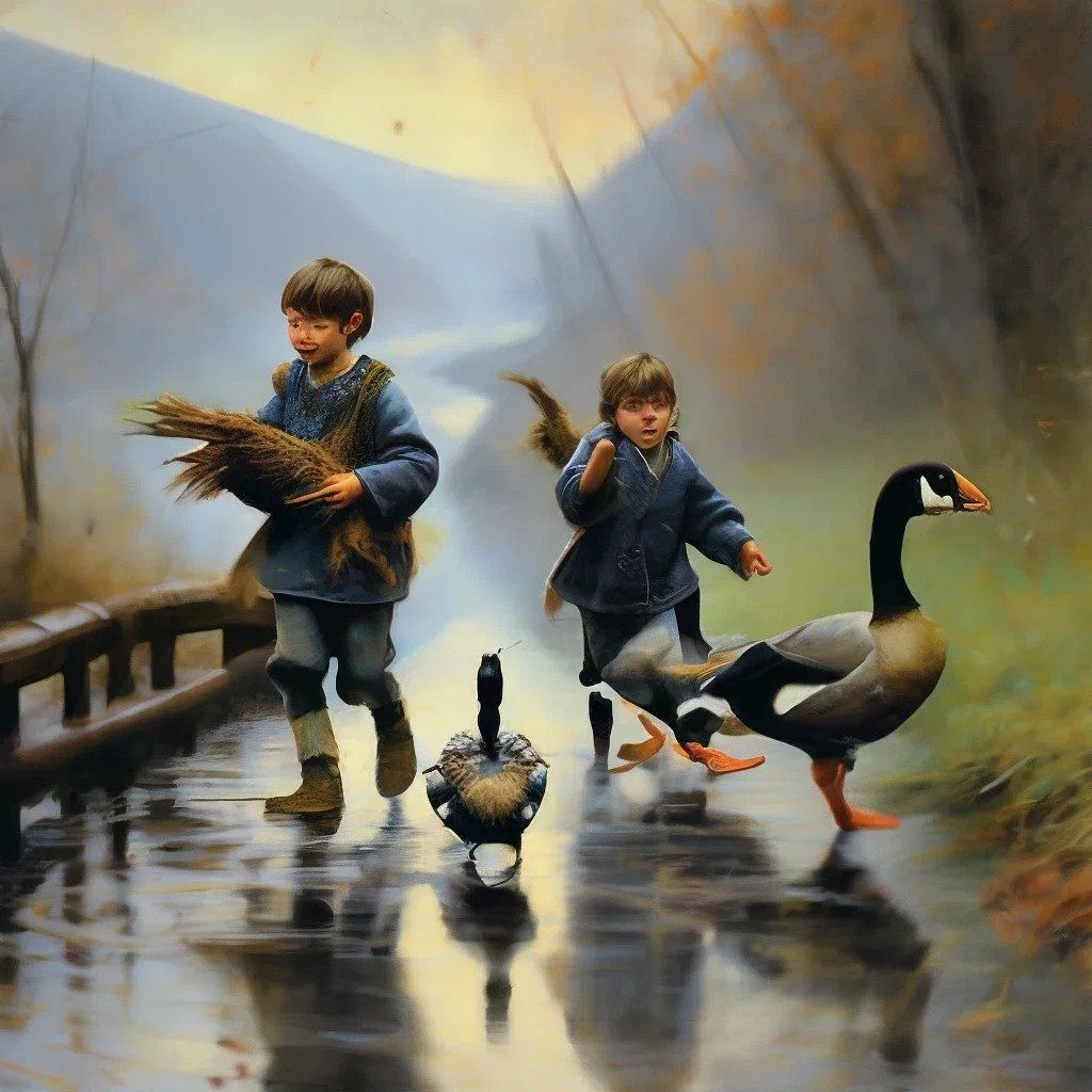 Мы, вооружившись двумя хворостинами, улюлюкая и крича, двинули стадо гусей в сторону дома бабушки. Гуси шли неохотно, периодически гогоча, и самые старшие из них, с тёмными клювами и мешками над шеей, время от времени резко разворачивались и страшно шипели на нас. Но несмотря на наш страх перед гусями, страх быть отлупленными нашими мамами всё-таки побеждал. Мы героически, несмотря на окончательно опустившийся ливень, гнали упирающееся стадо вперед, в сторону спасительного дома. Вот уже и мостик. Гуси, явно нежелающие идти на него, принялись высказывать недовольство уже большей группой, нежели только вожаки: