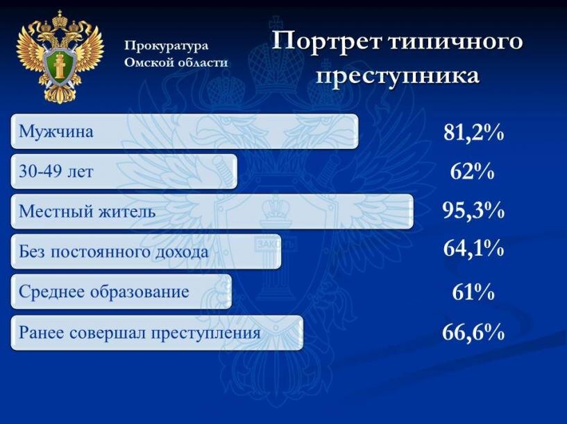На основании статистики за 2024 год прокуратура Омской области определила социальный портрет преступника. В минувшем году правоохранительные органы выявили 8 167 человек, совершивших преступления в регионе. Подавляющее большинство из них — местные жители (95,3 %, или 7 780 человек). Есть и другие отличающие черты преступников в регионе.