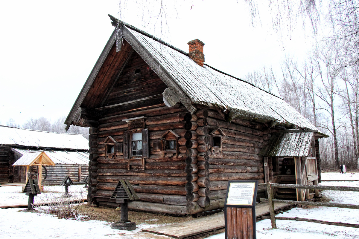 Балки двускатной крыши с фасадной стороны и оконные ставни украшены глухой домовой резьбой. Убранство дома – радость для фотографа) и тех, кто хочет заглянуть на полтора века назад в крестьянское жилище. Русская печь, ткацкий станок, кровать, детская люлька, прялка, сундуки, ящик для рукоделия, Святой угол, расставленная кухонная утварь- чугунный котел, подвешенный чайник со смешным носиком, кадки, плошки. Экспозицию завершают стол, покрытый скатертью и высушенные букеты трав, подвязанные веревкой к стене.
