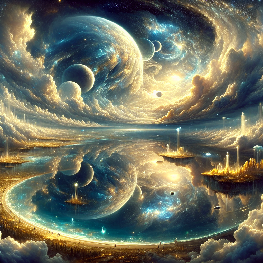 Между облаками на высоте, где ветры уже давно стали частью сказки, раскинулось огромное водное зеркало. Это озеро собирает отражения неба со всех измерений, и когда смотришь в него, можно увидеть не только облачное небо, но и целые планеты, луны и галактики, парящие среди его волн. Вода здесь не течёт, а повинуется времени – если коснуться её поверхности, можно на миг заглянуть в далёкое будущее или прошлое. По берегам растут золотые деревья, их листья уносятся в воздух и превращаются в сияющие песчинки, которые никогда не падают, а остаются кружиться в танце вечности.