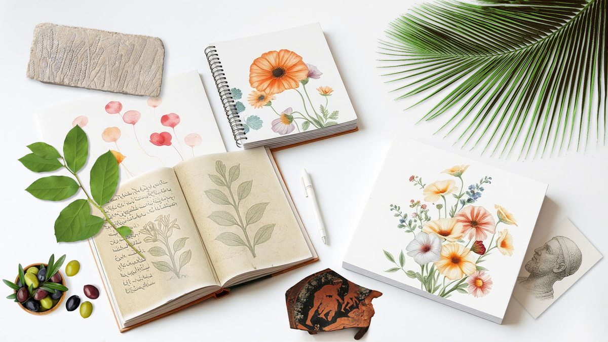В Древнем Египте растения изображали красками на папирусе и высекали на камне. В Греции — писали на пергаменте и керамике минеральными и растительными пигментами. В Риме — создавали иллюстрации в медицинских кодексах на пергаменте, используя чернила и краски на основе охры, угля и сажи.