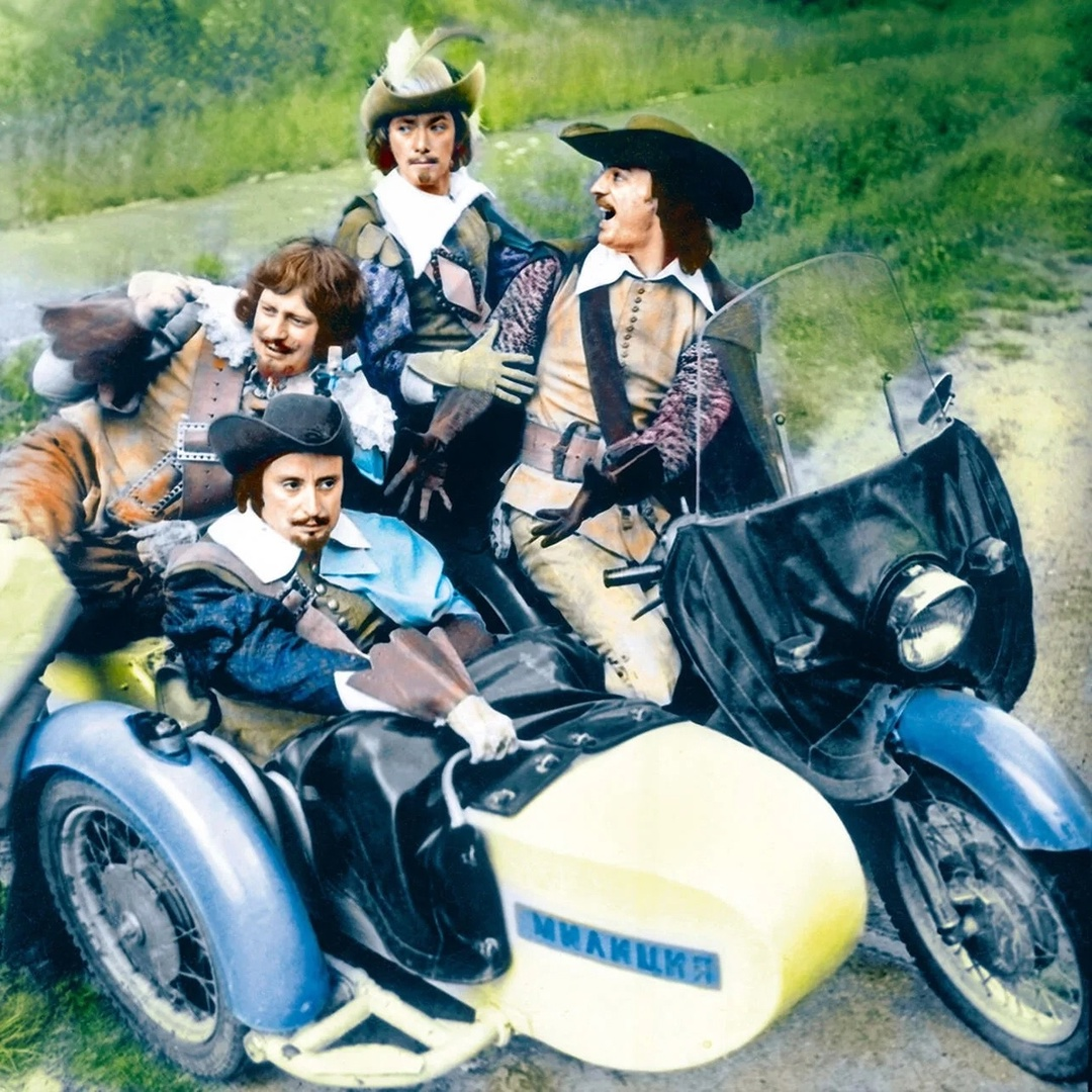 Во-первых актеры там очень много пили алкоголя и катались в костюме мушкетеров на мотоцикле с каляской, распугивая местных пионеров и комсомольцев.