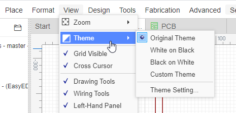 EasyEDA поддерживает мощную функцию тем для окна Schematic. Через: Верхнее меню - View - Theme. Original Theme: Тема по умолчанию, работает только для размещения новой детали. White on Black: Белое на черном, объекты будут белыми, фон будет черным. Black on White: Черное на белом. User Definded: При изменении стиля темы, окно Schematic будет следовать вашим параметрам темы "Моя тема". My Theme: Пользовательская тема, которая хранится локально в браузере и будет синхронизирована с сервером. При нажатии кнопки «apply» эта тема будет применена к текущей схеме. В следующий раз, когда вы откроете схему, темой схемы будет пользовательская тема. My theme Settings: Вы можете применить "My theme" на: 1. Создание новой схемы (Creating New Schematic), 2. Открытие существующей схемы (Opening Existed Schematic). Если вы использовали какую-либо тему для схемы, вам нужно сделать UNDO, чтобы вернуться к предыдущей цветовой теме. «Original Theme» ничем не поможет. Тема схемы будет синхронизирована с се