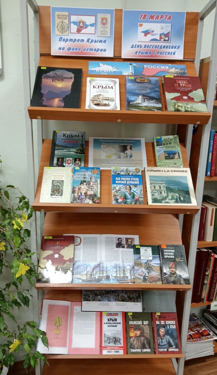 В Столбовской библиотеке имени О.Ф. Кургузова м. о. Чехов оформили книжную выставку «Портрет Крыма на фоне истории» в честь присоединения полуострова Крым в состав Российской Федерации. Из литературы, представленной на экспозиции, можно узнать о многолетней истории Крыма с древних времён до сегодняшних дней. Выставка продолжит свою работу до 20 марта. Адрес проведения: г. Чехов, р.п. Столбовая, Школьная улица, д.9