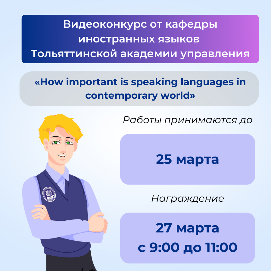 📢Тольяттинская академия управления приглашает учащихся 10-11 классов, студентов и выпускников учреждений среднего профессионального образования принять участие в видеоконкурсе «How important is speaking languages in contemporary world» от кафедры иностранных языков! 🎬Для участия в конкурсе принимаются видеоролики участников на тему «Насколько важно владеть языками в современном мире» на английском языке. 👀Видеоконкурс «How important is speaking languages in contemporary world» проводится дистанционно. Рекомендуемая длительность — 1-2 минуты. 👉Регистрация на конкурс по ссылке: https://forms.yandex.ru/u/67cffb4d6d2d730b4c0c2df6/