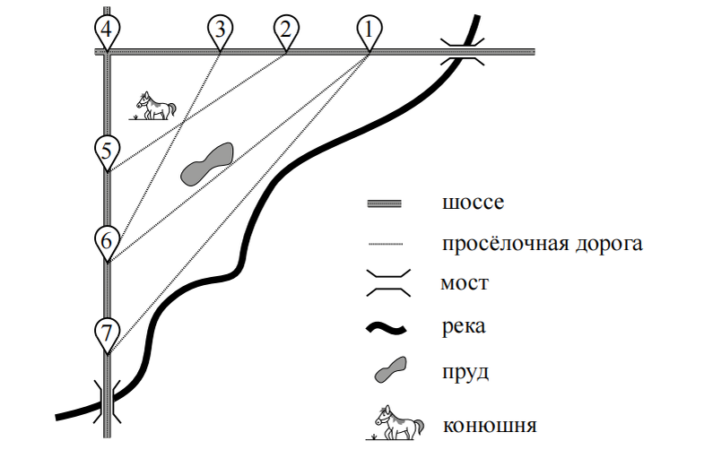 Здравствуйте дорогие подписчики и гости канала Предлагаю разбор первых пяти заданий из работы Статграда, разбор заданий 6-19 был тут И анонсирую в выходные выход поста по второй части, а пока деревни На рисунке изображён план сельской местности. Таня на летних каникулах приезжает в гости к дедушке в деревню Антоновку (на плане обозначена цифрой 1). В конце каникул дедушка на машине собирается отвезти Таню на автобусную станцию, которая находится в деревне Богданово. Из Антоновки в Богданово можно проехать по просёлочной дороге мимо реки. Есть другой путь — по шоссе до деревни Ванютино, где нужно повернуть под прямым углом налево на другое шоссе, ведущее в Богданово. Третий маршрут проходит по просёлочной дороге мимо пруда до деревни Горюново, где можно свернуть на шоссе до Богданова. Четвёртый маршрут пролегает по шоссе до деревни Доломино, от Доломина до Горюнова по просёлочной дороге мимо конюшни и от Горюнова до Богданова по шоссе. Ещё один маршрут проходит по шоссе до деревни Е