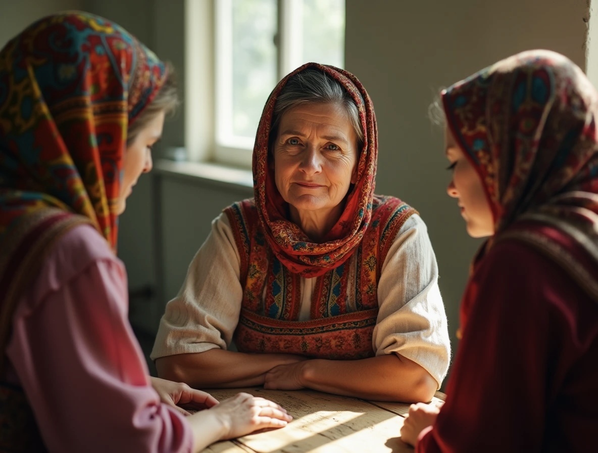 В избе стало тихо – только ветер за окном выл да угли потрескивали. Катя ахнула, прикрыла рот ладонью, а Нина так и замерла с фартуком в руках. Марья подалась вперёд, локти на стол упёрла: