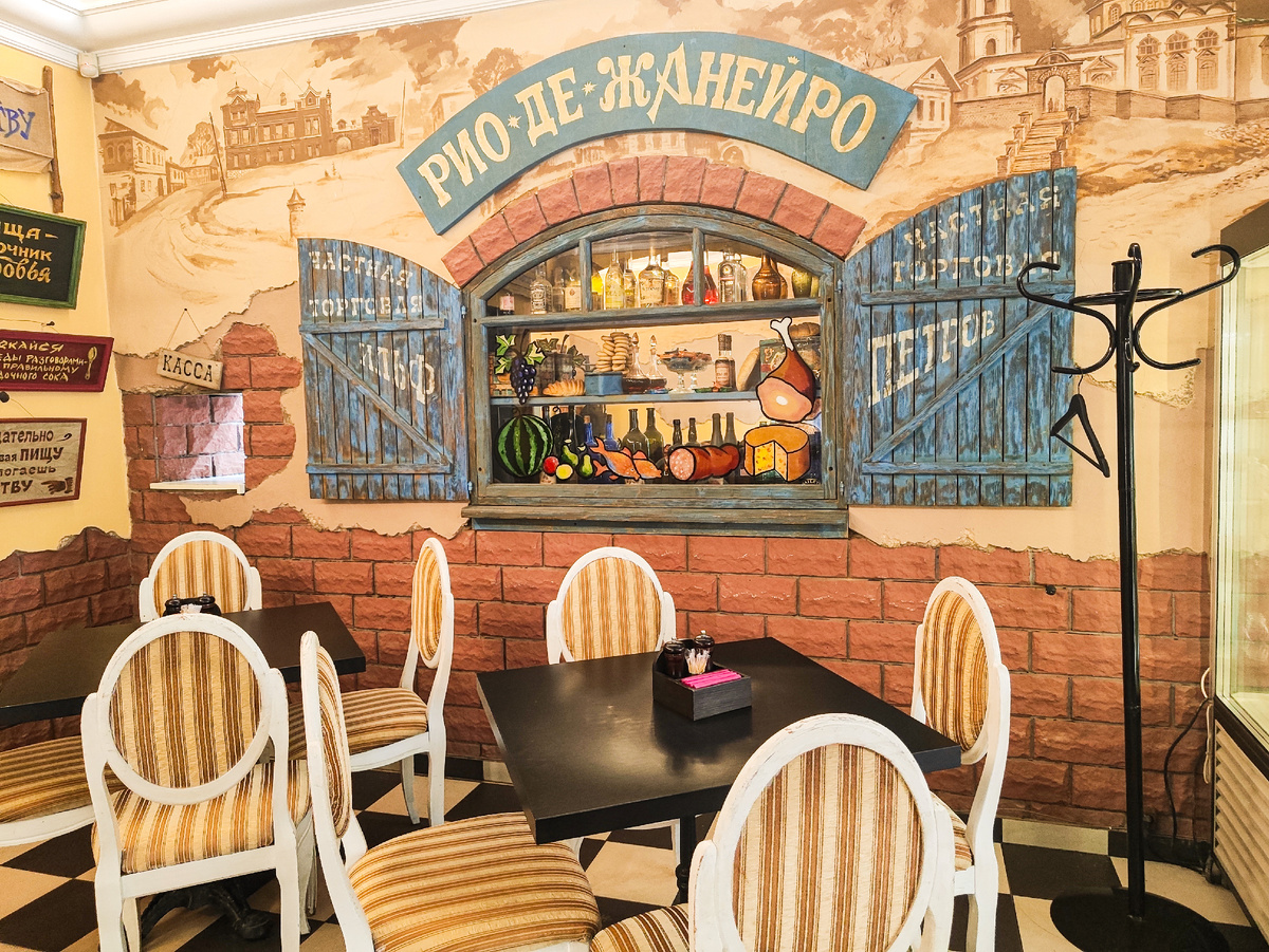 Интерьер в этом кафе замечательный, попадая сюда мы как будто переносимся на страницы книг Ильи Ильфа и Евгения Петрова. Неделю тому назад состоялся вечер «Общества спасания на водах», о чём свидетельствовал также лозунг на стене: