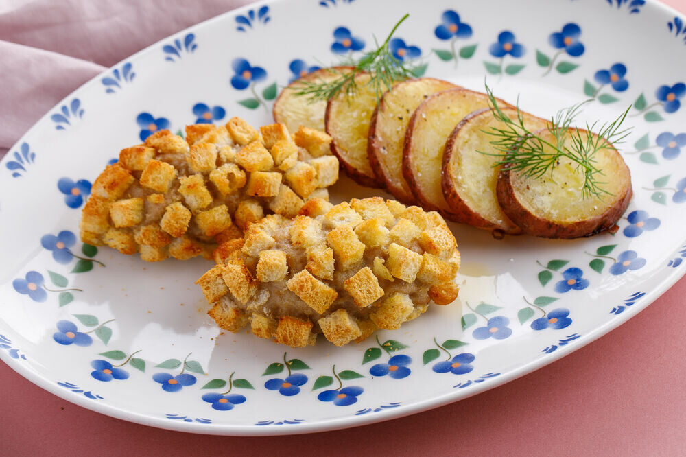 С батона срезать корочку и нарезать 300 г батона на мелкие кубики и пересыпать на противень, застеленный бумагой для выпечки. Нагреть духовку до 150°С и отправить противень на 15-20 минут в духовку, сушить сухарики. 100 г батона, нарезанного ломтиками, уложить в тарелку и залить молоком, оставить на 5 минут. Куриное филе и отжатые от молока ломтики батона, измельчить в мясорубке. В фарш добавить соль, перец, 3 ст.л. размягченного сливочное масла, сливки и хорошо взбить фарш до однородного состояния, в течении 10-15 минут. Отправить фарш на 15 минут в холодильник. Сформировать небольшие котлеты и обвалять их со всех сторон в подготовленных сухариках. Нагреть сковороду на слабом огне, добавить 4 ст.л. растительного масла и 1 ст.л. сливочного масла, выложить котлеты и обжарить с обеих сторон до золотистого цвета сухариков, по 3-4 минуты на слабом огне с каждой стороны. Переложить котлеты на противень, застеленный бумагой для выпечки и отправить в нагретую до 180°С духовку на 15 минут, в