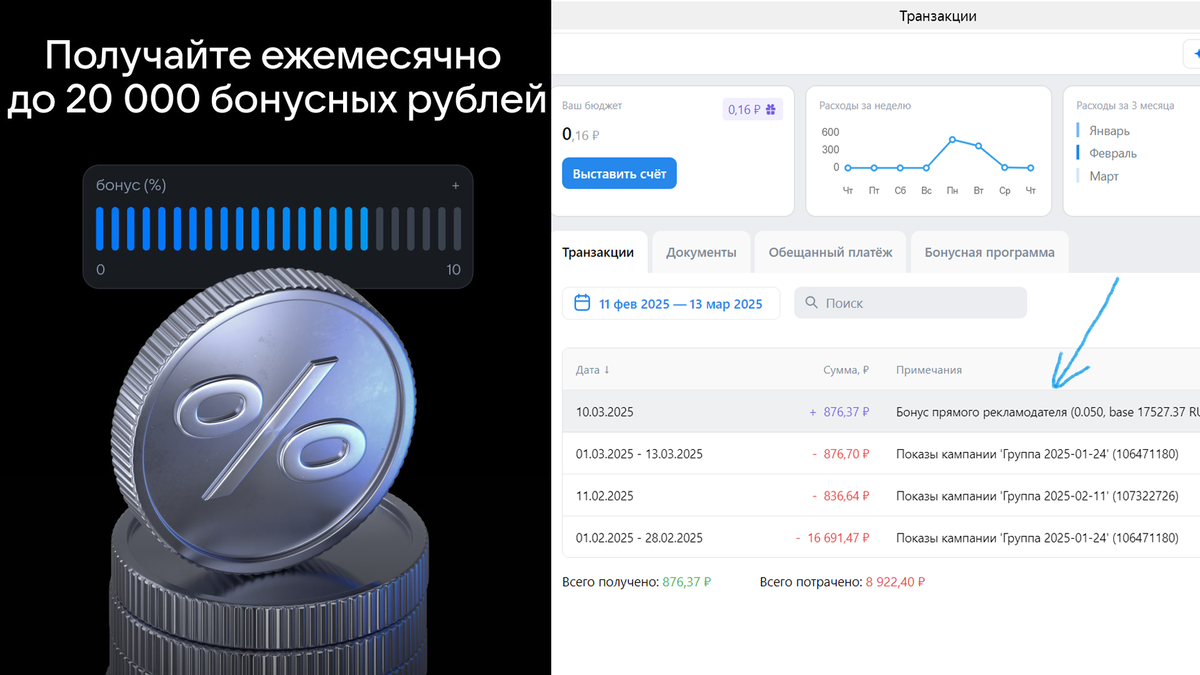 Регулярное пополнение бюджета рекламного кабинета дарит вам до 10% от бюджета, потраченного на рекламу. Расчет суммы идёт без учета 20-ти процентного НДС. Начисление бонусов идет в следующий месяц, пример в скриншоте.