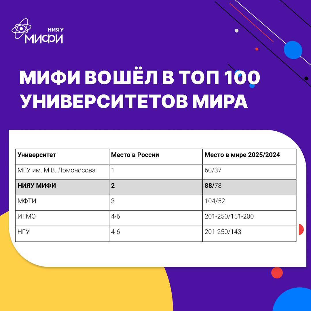 МИФИ ВОШЁЛ В ТОП 100 УНИВЕРСИТЕТОВ МИРА ПРЕДМЕТНОГО РЕЙТИНГА QS PHYSICS & ASTRONOMY 2025, ЗАНЯВ II-МЕСТО В РОССИИ