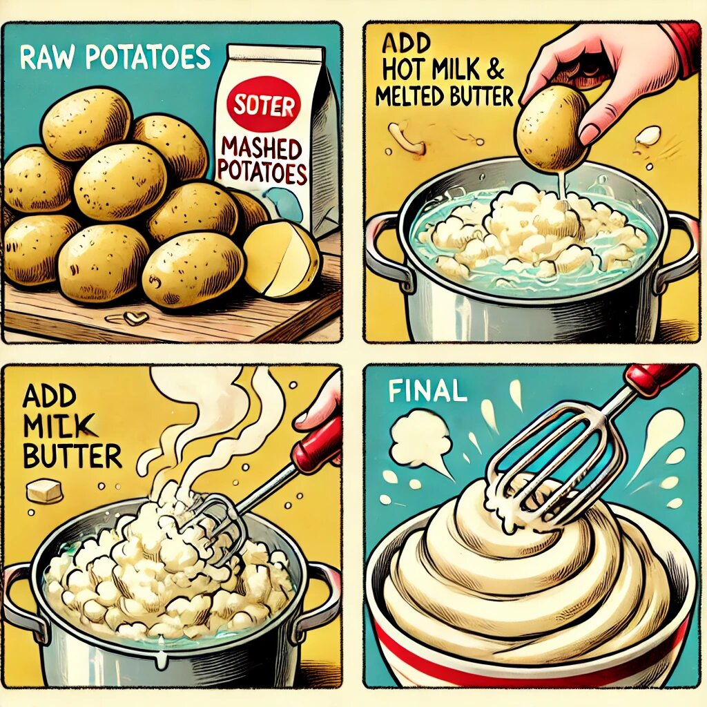 Лучшее пюре получается из крахмалистых сортов (например, «Беллароза» или «Синеглазка»). Они разваристые и дают нужную текстуру. 2️⃣ Варим правильно 3️⃣ Сливаем воду и подсушиваем 4️⃣ Добавляем горячее молоко и масло 5️⃣ Разминаем правильно 6️⃣ Финальный штрих ❌ Миф: Пюре можно сделать блендером — так будет быстрее.