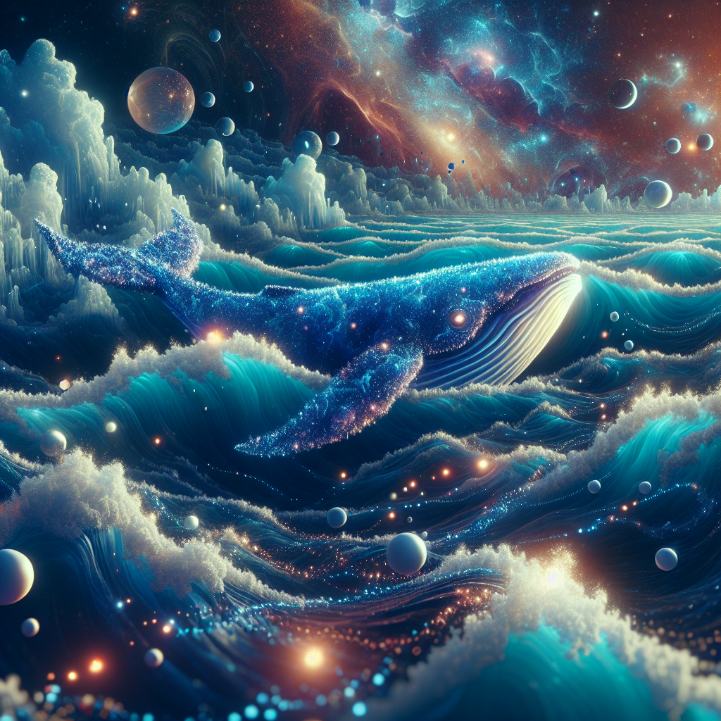 Представь себе бескрайние волны не воды, а голубоватой светящейся субстанции, похожей на жидкий свет. Эти волны подсвечены изнутри мерцающими искрами, будто каждый капля содержит крошечную звезду. Вокруг воды плывут гигантские медленные существа — словно киты, но сотканные из прозрачных туманностей. Над этим океаном нет привычного неба, вместо него — завораживающий космос, расчерченный медленно движущимися планетами. Иногда с высоты опускаются светящиеся сферы, пролетают над водой, оставляя за собой шлейфы сияющих следов, и исчезают вдалеке.