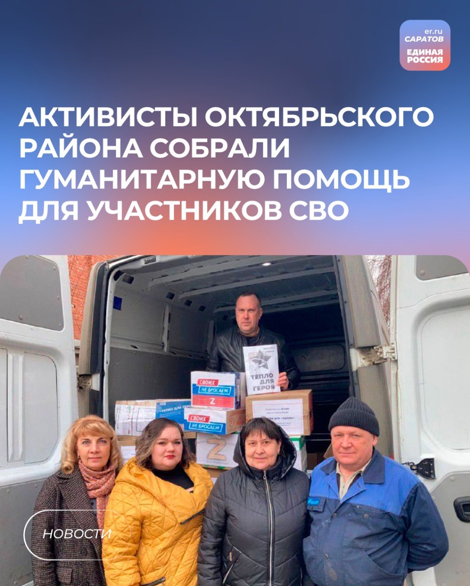 📦Пункты сбора и отправки гуманитарной помощи работают во всех местных отделениях партии «Единая Россия». В рамках акции «Тепло для героя» депутат Саратовской городской Думы Ирина Видина вместе с активистами местного отделения партии «Единая Россия» Октябрьского района подготовили для бойцов, находящихся в зоне СВО, маскировочные сети, посылки с продуктами длительного срока хранения, средствами личной гигиены. 💬«Сбор гуманитарной помощи - лишь малая часть того, что мы можем сделать для ребят, находящихся на передовой. Радует, что среди нас так много людей с добрыми и отзывчивыми сердцами», - поделилась региональный координатор проекта «Старшее поколение» партии «Единая Россия» Ирина Видина.