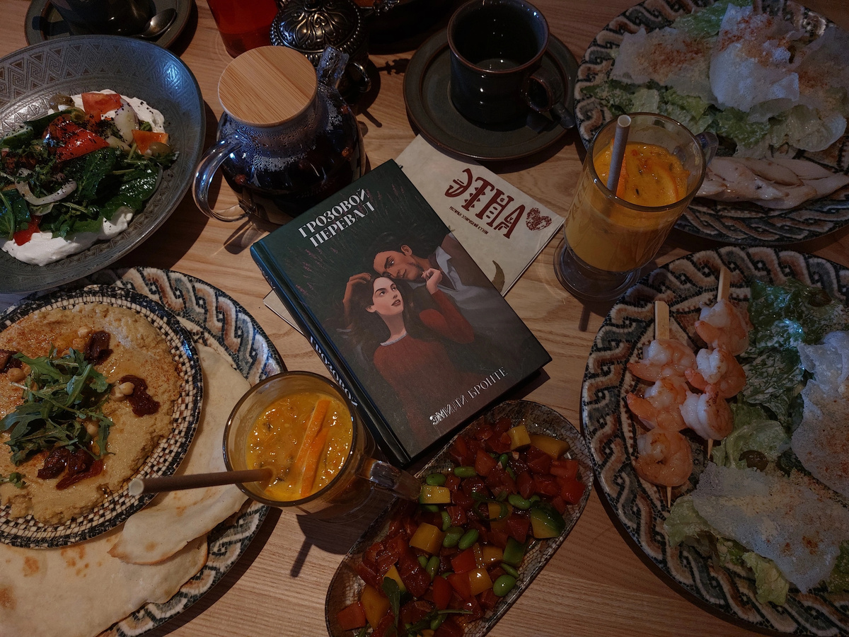 Собирались в ресторане книжным клубом. Идея показалась отличной: яркие блюда из разных стран мира, колоритный декор, этно-музыка. Первое впечатление, визуальное, было приятным. Мозаики, ленты, экспрессивный идол у входа. Очень подкупила фишка: блюда разных кухонь мира подаются на тарелках с национальными мотивами. Второе впечатление, гастрономическое, тоже сначала понравилось: у моего овощного салата был очень нежный вкус. Ну пока мне не попался ядрёный-преядрёный красный лук. Обычно его кипятком ошпаривают или как-то по другому смягчают вкус. А так шутили с девочками: - Ууууу, прямо сильное желание кого-нибудь поцеловать. - Повара! У подруги " Цезарь" имел ярко выраженный рыбный вкус. Тут спорно: так-то по одному из популярных рецептов в салат идёт соус с анчоусами. И это может быть норм. Просто подруга моя рыбов не ест. Ей не зашло, кому-то, может быть, вполне будет здорово. Один напиток попросила, не смогли принести, закончился. Второй попросила, та же история... - Ну дайте мне хоть